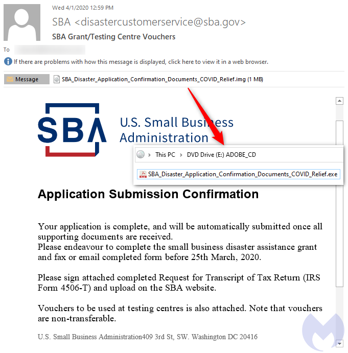 This initiative took place in April, and was the first phishing attack targeting the SBA. To escape detection, the malware came attached in a small (1MB) IMG disc-image format.