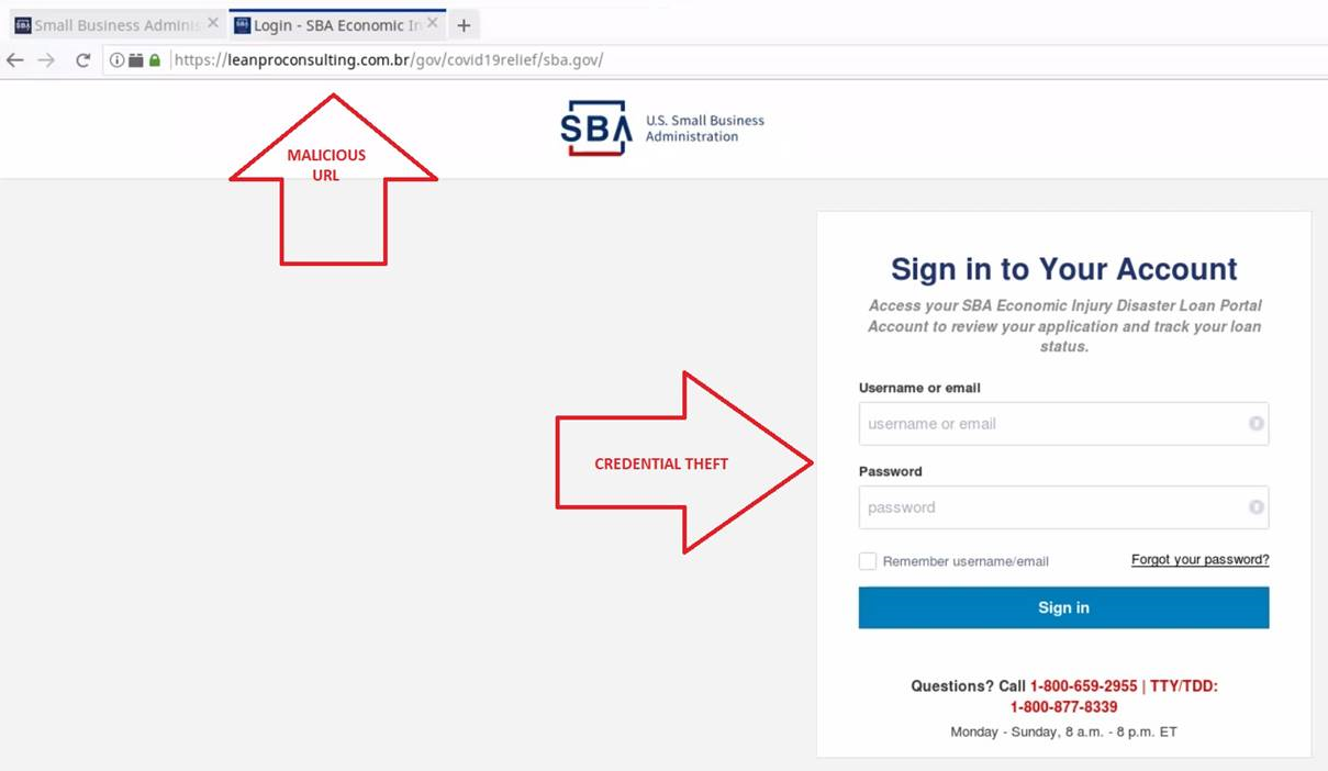 A link in the email body promises to take the recipient to the account sign-in page on the SBA website. Credentials entered on this page end up with the attacker.